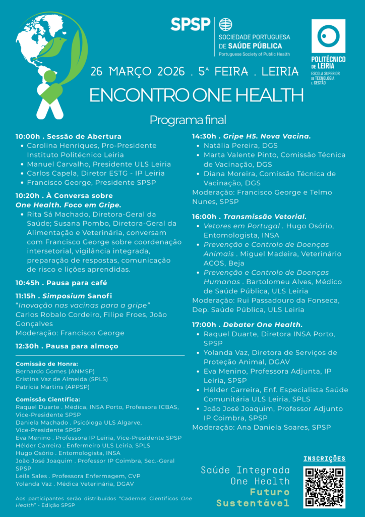 Para mais informação, consulte a página Encontro One Health — 26 de março 2026 | Leiria — Programa final e inscrições abertas – SPSP