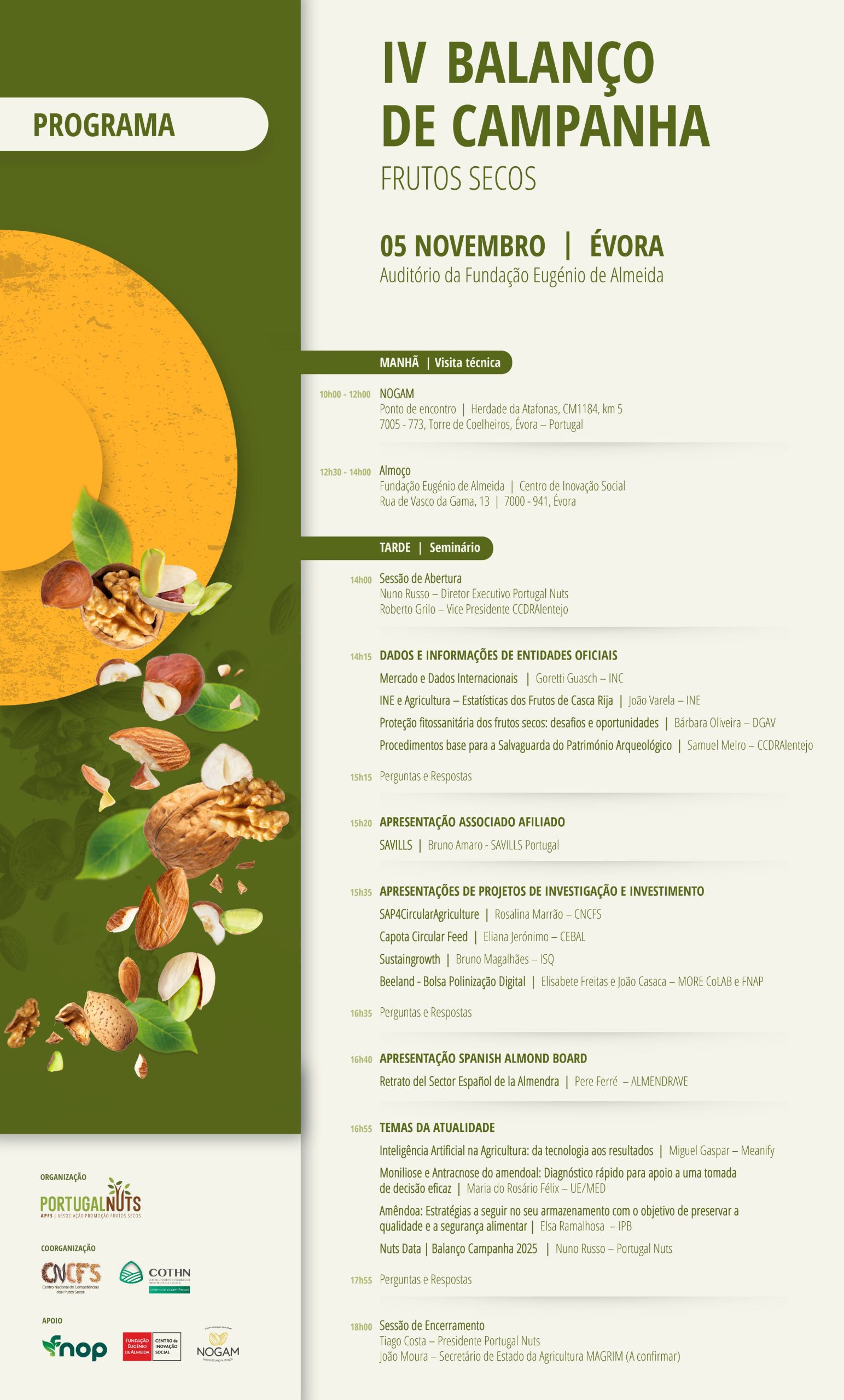 O programa completo está disponível aqui, e as inscrições podem ser realizadas através do link: IV Balanço de Campanha dos Frutos Secos.